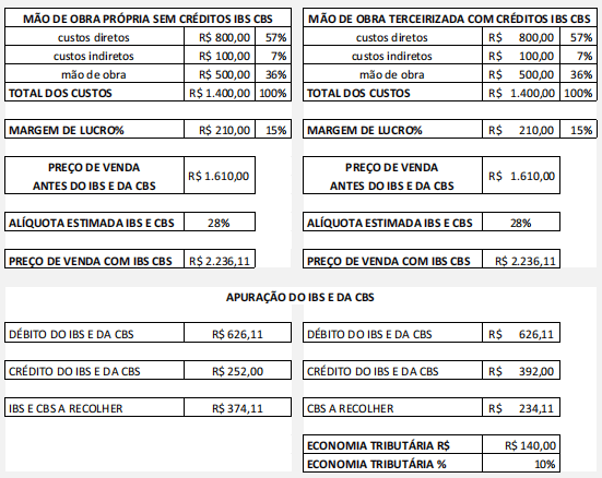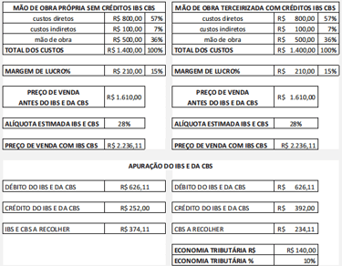 Partindo desta situação já definida, fizemos duas simulações, sendo que na primeira levamos em conta a mão de obra própria, que não gera crédito do IBS e da CBS.